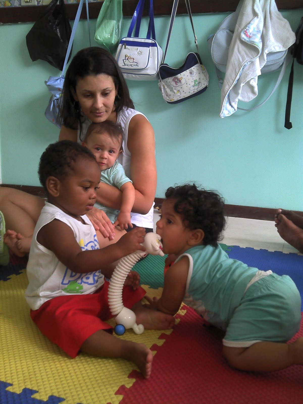 As crianças do berçário divertiram-se bastante com brincadeiras de rolar, de bola, música, etc. Uma farra total!